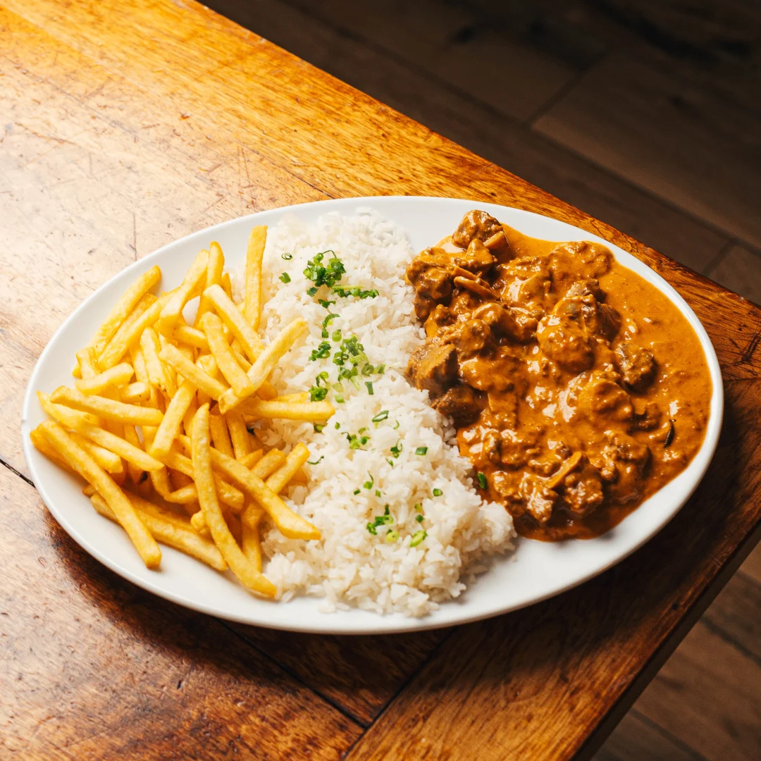 Suculento strogonoff de filé mignon, cremoso e saboroso, servido com arroz branco soltinho e batatas fritas crocantes, uma combinação clássica e irresistível.