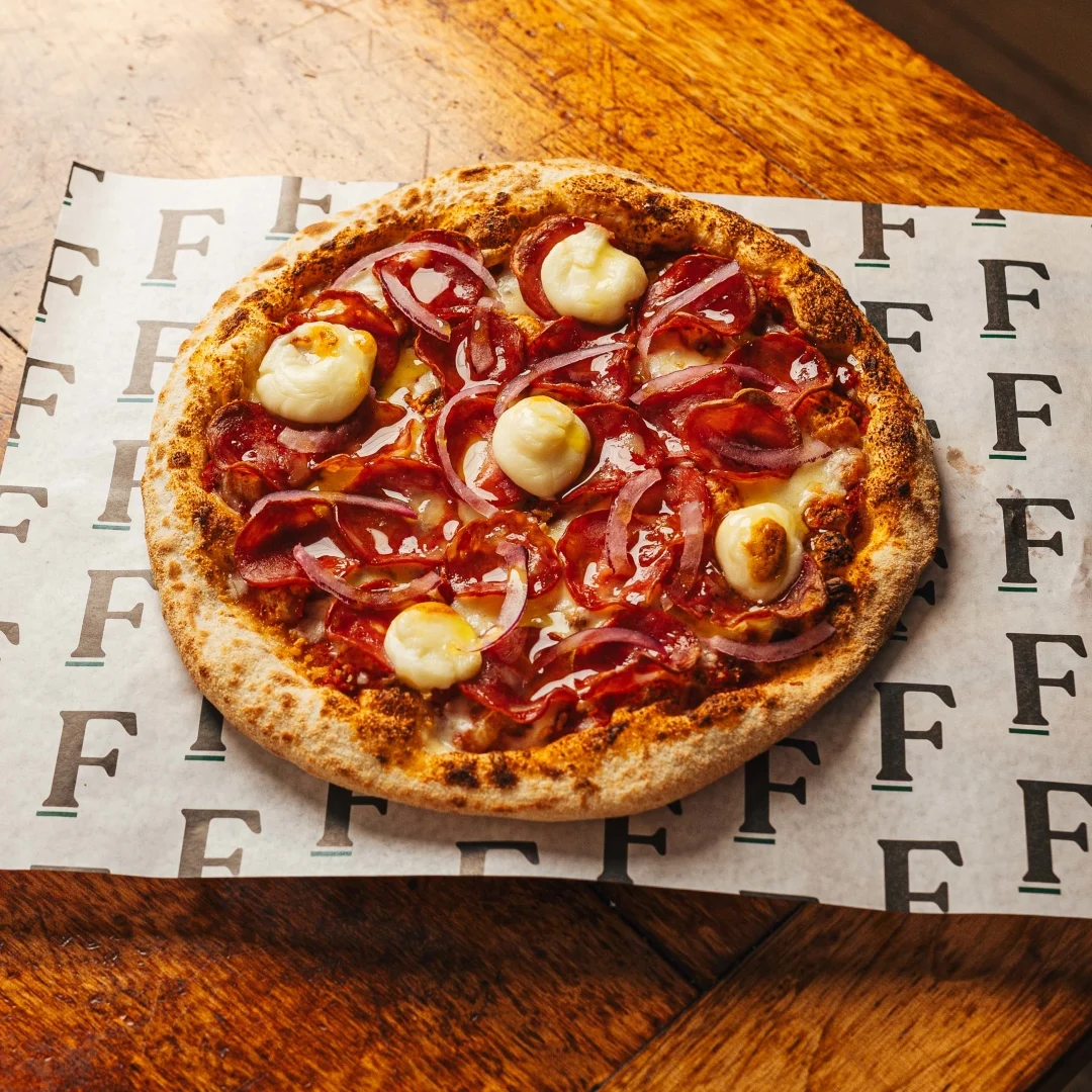 Calabresa marcante, cebola roxa, alho frito dourado no ponto e requeijão que envolve cada fatia. Intensa, aromática e irresistível.