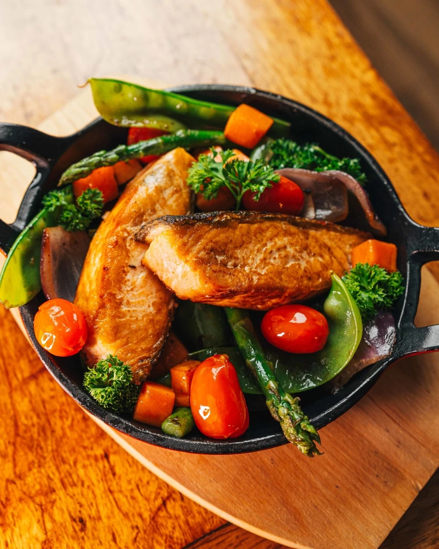 Salmão grelhado acompanhado de aspargos crocantes, cubos de cenoura dourados, ervilha-torta, pétalas de cebola roxa e tomates confitados.