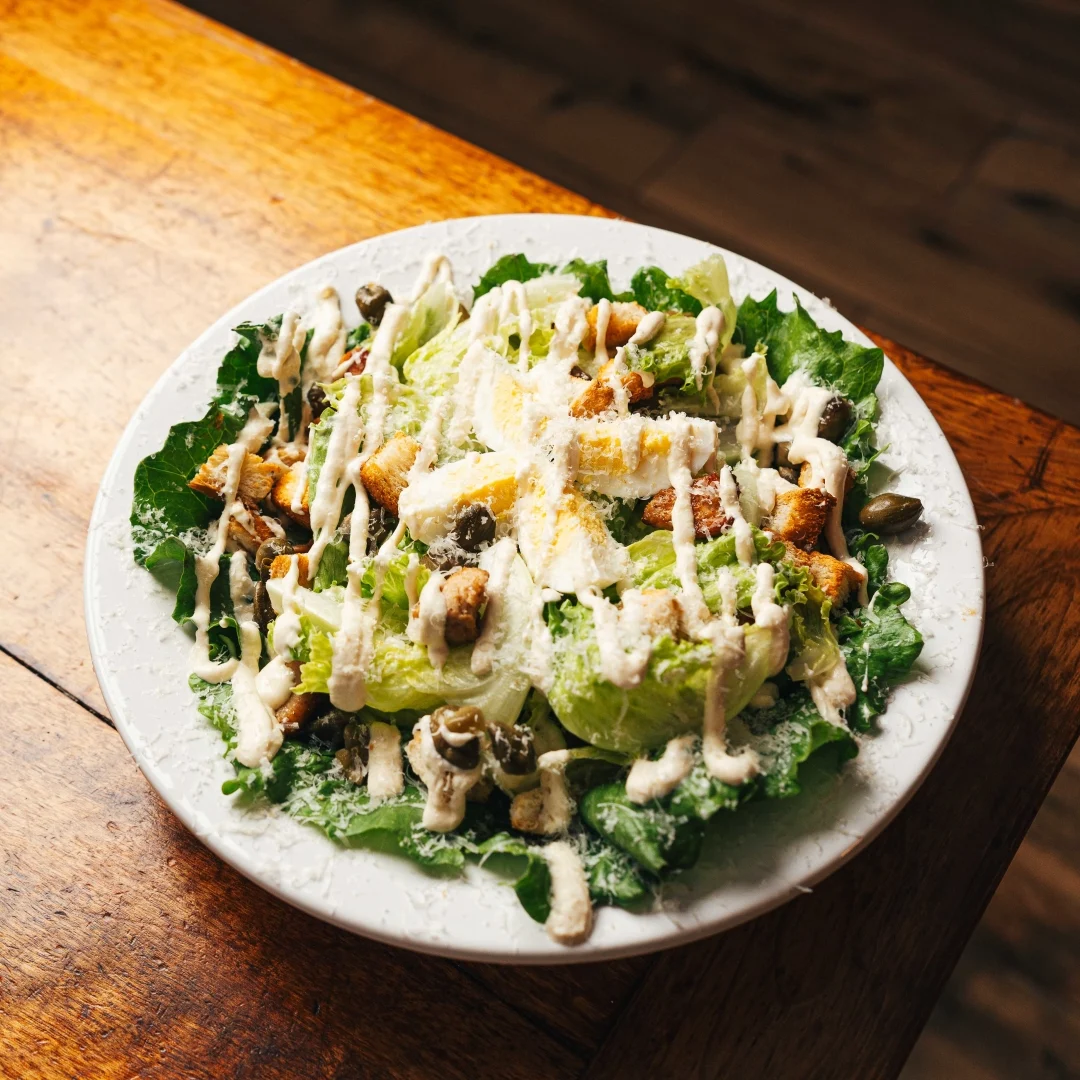 Alface, 100g de frango em cubos, ovo cozido, alcaparras, crutons, parmesão e molho original caesar. (550g)
