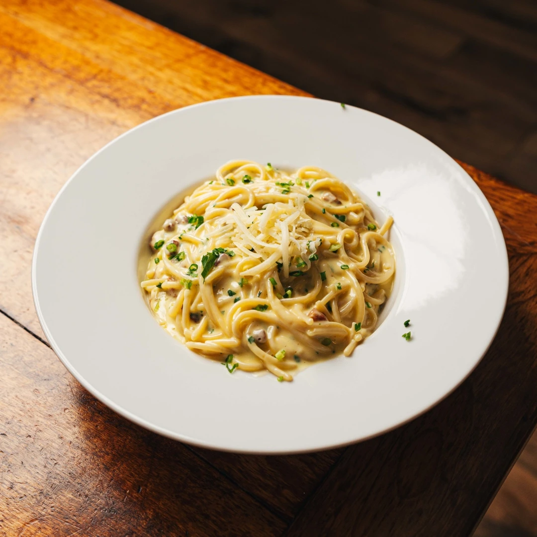 Massa envolvida em molho cremoso preparado com creme de leite, bacon crocante, ovos frescos, queijo parmesão e temperos especiais da casa, uma combinação rica e muito saborosa.