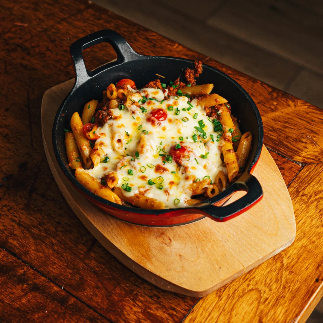 Penne al dente envolvidos em molho sugo rico, preparado com carne moída de qualidade, temperado com azeite de oliva e os segredos da casa. Coberto com queijo parmesão derretido e gratinado, trazendo uma textura cremosa e um sabor irresistível a cada garfada.