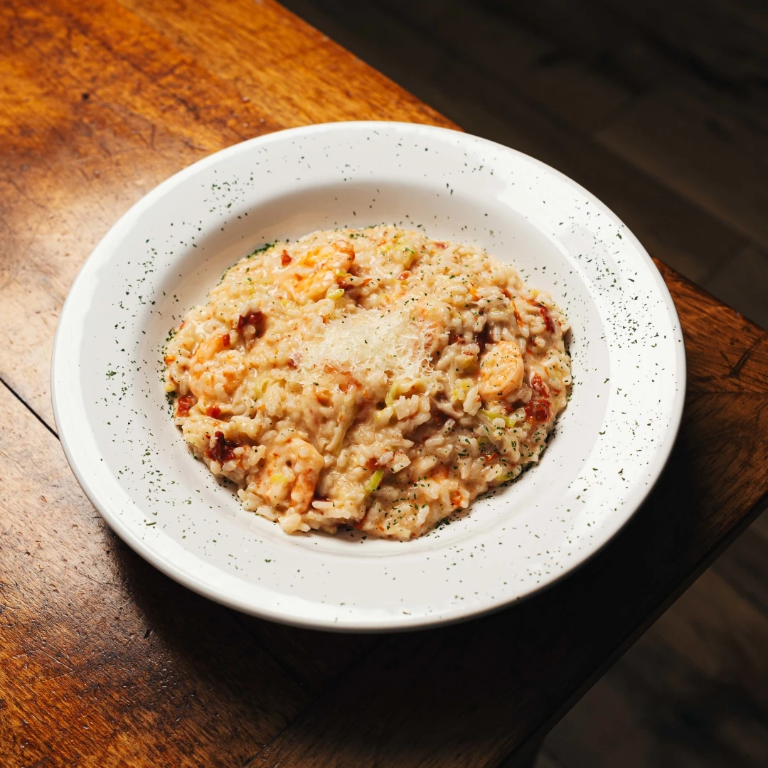 Risoto cremoso de camarões frescos, delicadamente combinado com o aroma suave e levemente adocicado do alho-poró, resultando em uma experiência saborosa e elegante.