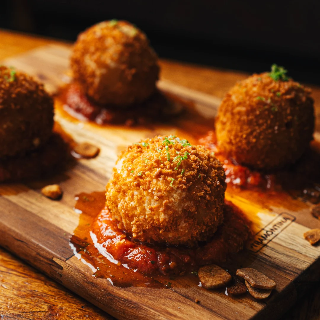 Crocantes bolinhos de risoto recheados com salmão, servidos sobre molho marinara rústico ao perfume de alho dourado.