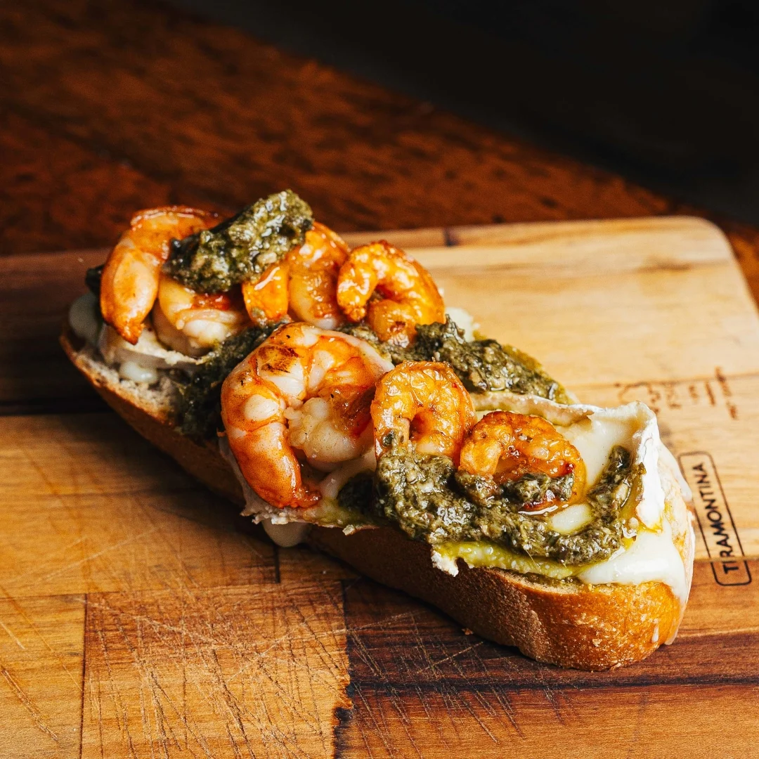 Pão crocante levemente tostado, camarões suculentos, queijo brie cremoso e o aroma fresco do pesto de manjericão, uma combinação elegante e saborosa do mar ao mediterrâneo.
