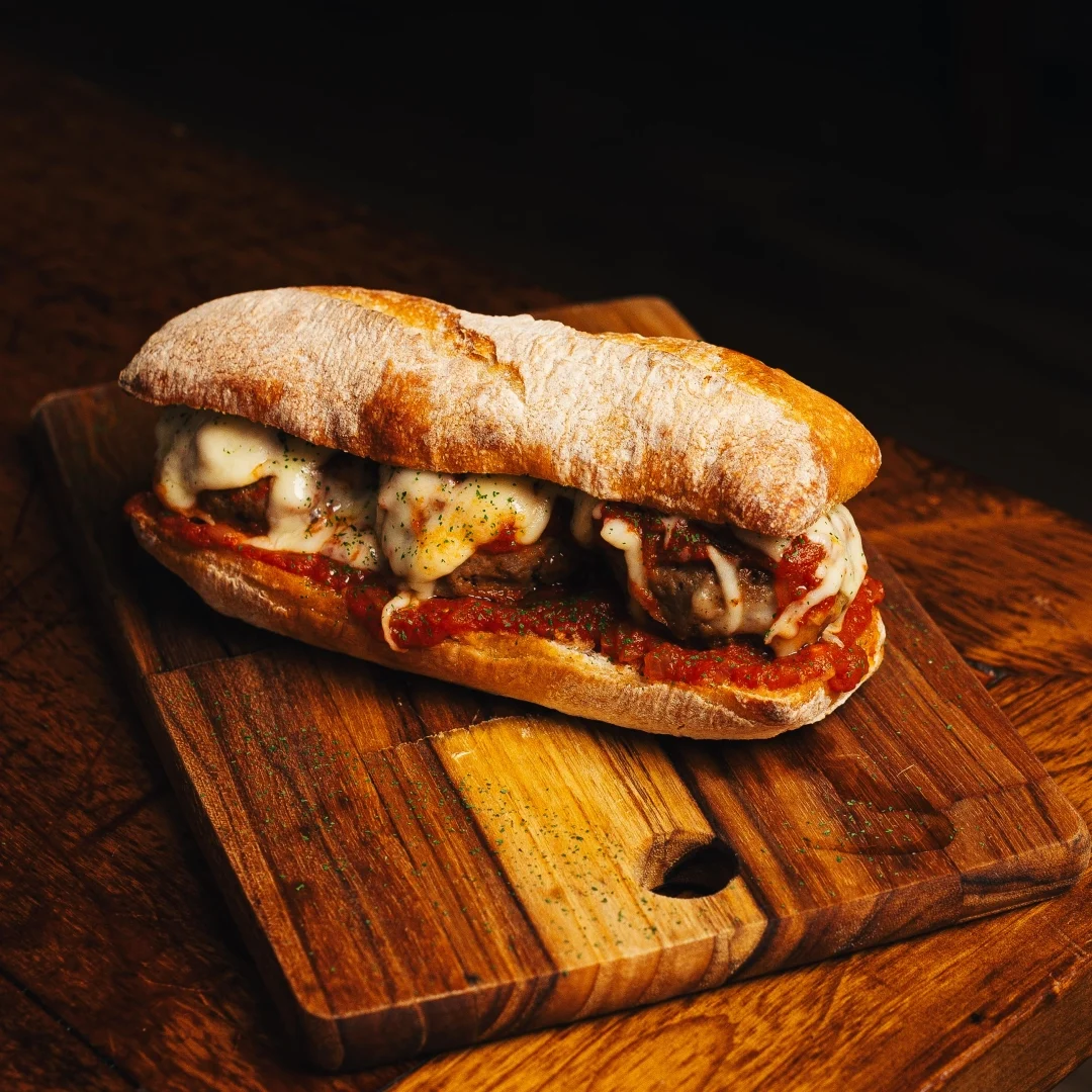 Nosso pão artesanal, almôndegas, mussarela e molho sugo.